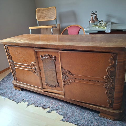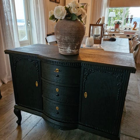 Stor gammeldags skjenk med plass til mye oppbevaring Den har flere hyller og to skuffer,solid heltre og laget med gammelt godt håndverk.Fine utskjæringer,den er malt i matt sort farge.Passer like fin til stue som,gang/entré ,soverom.