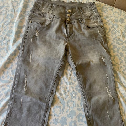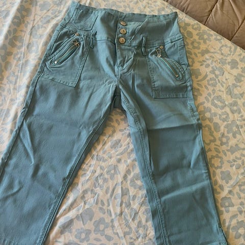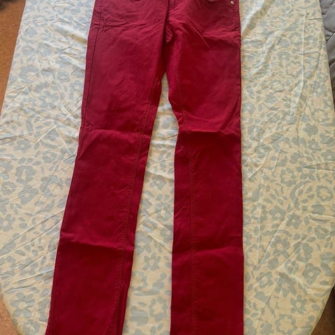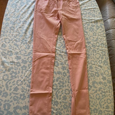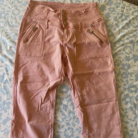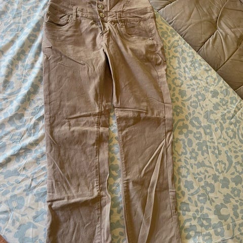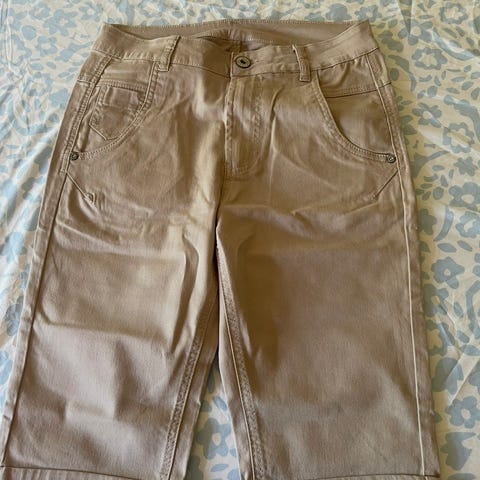 Ny Floyd bukse for dame i størrelse 27/17. Buksen er beige og laget i bomull. Modellen har høyt liv med knappelukking foran og flere lommer både foran og bak. Egnet til hverdagsbruk og kan kombineres med ulike topper og jakker.