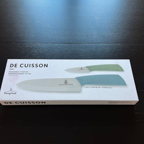 Brødkniv på 21 cm fremstilt med et knivblad i porselen fra Porsgrunds Porselænsfabrik og serien De Cuisson. Porselenet vil aldri kunne sette smak i maten, og er laget i et materiale plassert rett under diamant på hardhetsskalaen. Kniven rengjøres for hånd og må ikke brukes på frossen mat.