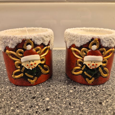 Koselige telyshaldarar i keramikk med nisse og små hol som slepp lyset fint gjennom. Selges som par.