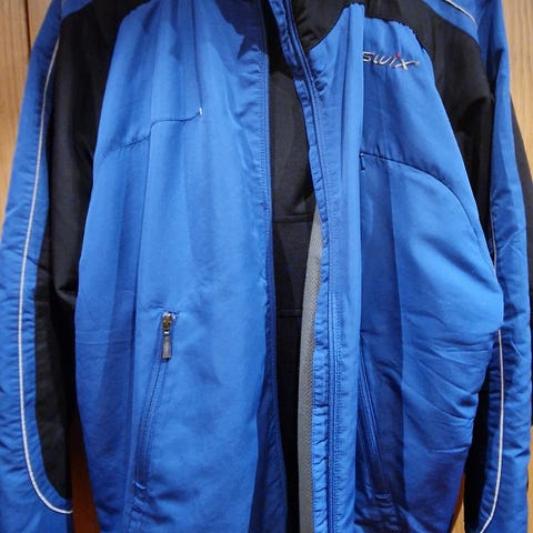 Sett med jakke og bukse i rød og marineblå farge. Jakken har hel glidelås foran, høy krage og lomme med glidelås på brystet.