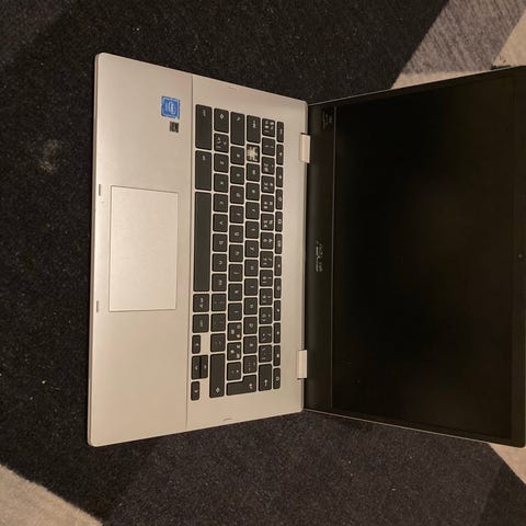 Enheten kjører ChromeOS og har innebygd tastatur med nordisk layout. Skjermen er i farge og maskinen leveres med strømforsyning/lader, som vist på bildene.