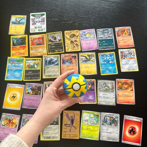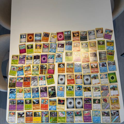 Blandet samling av Pokémon-kort i ulike typer og serier. Bildene viser en eske med løse kort, samt kortstokk(er) med blant annet energikort og forskjellige Pokémon. Kortene ser ut til å være i standard størrelse for Pokémon TCG.