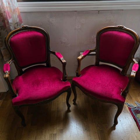 Lenestoler med utskåret treverk og polstring i rødt fløyelsstoff. Stolenes ramme er i tre med dekorative utskjæringer på armlener og ben, samt metallnagler langs kantene av setet. Rygg og sete er trukket i rødt, knappestoppet fløyel som gir en myk og strukturert overflate. Egner seg som sittemøbler i stue, salong eller andre oppholdsrom der man ønsker klassisk preg.