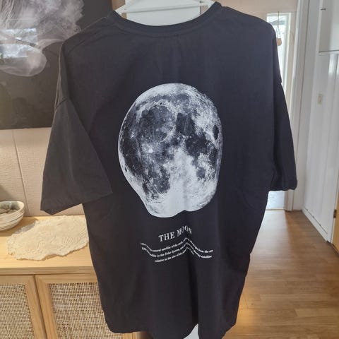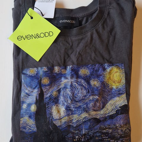Even&Odd T-skjorte for dame i størrelse L. T-skjorten er hvit og laget av bomull. Den har rund hals og korte ermer. Fronten har stort trykk med motiv av kaffe og croissant og teksten «Coffee & Croissant». På baksiden/foran øverst er det et lite kaffekopp-trykk. Passer som en casual hverdags-T-skjorte.