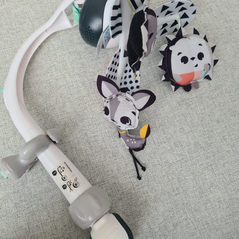 Tiny Love uroleken kan spille av 5 låter (30 minutter). Uroleken er enkel å henge opp, da det følger med en lang arm som er enkel å feste akkurat der den trengs.