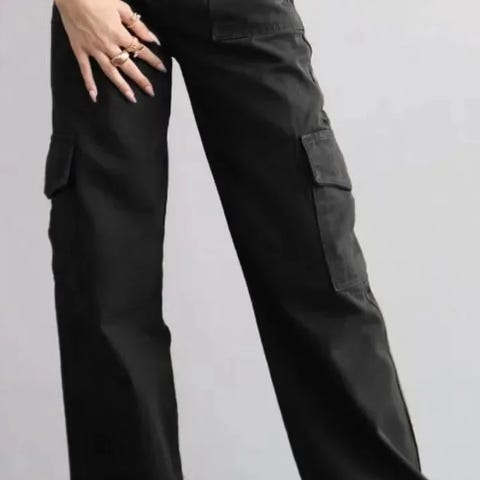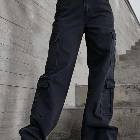 Bukse cargo for dame i størrelse XS. Buksen er svart og har flere lommer på sidene av beina. Den har strikk nederst ved anklene og snøring eller strikk i livet for justering av passform. Egnet til hverdagsbruk og fritidsaktiviteter.
