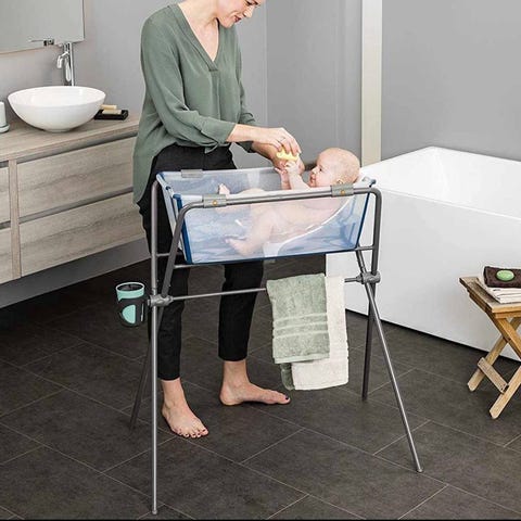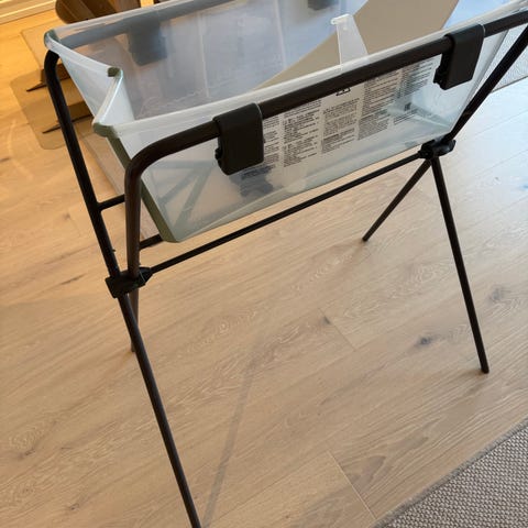 Sammenleggbart badekar. Stativet har kryssben som gir stabil støtte til et kompatibelt babybadekar. Egnet for bruk på bad eller andre rom med jevnt underlag. Utstyrt med festeanordninger for badekar og støttebånd for ekstra sikkerhet. Passer for foreldre som ønsker å heve babybadekaret til en mer ergonomisk arbeidshøyde under bading.