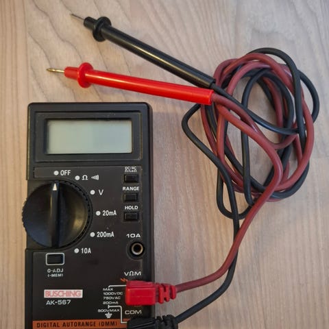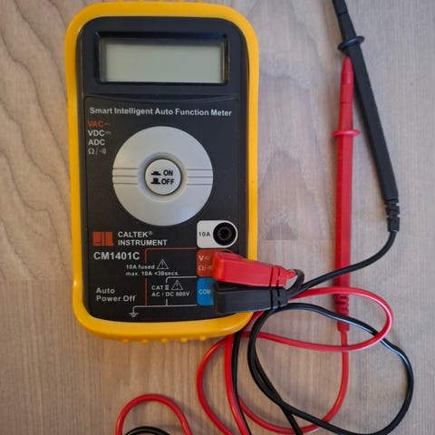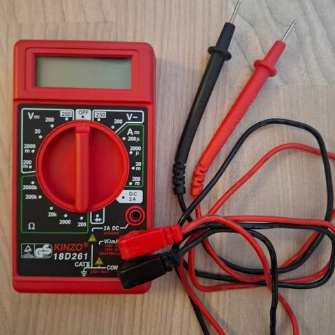 Mastech M-830B digitalt multimeter med tilhørende måleledninger. Multimeteret har roterende funksjonsvelger for måling av likespenning, vekselspenning, likestrøm, motstand og enkel transistor- og diodetest. LCD-skjerm for avlesning av måleverdier.