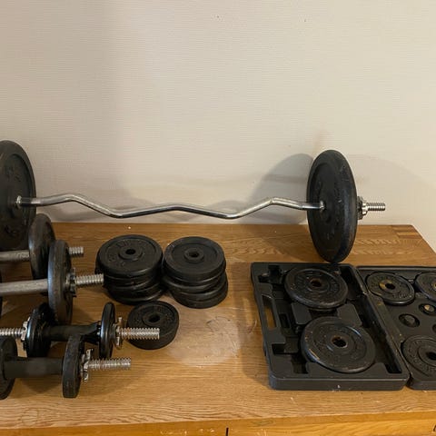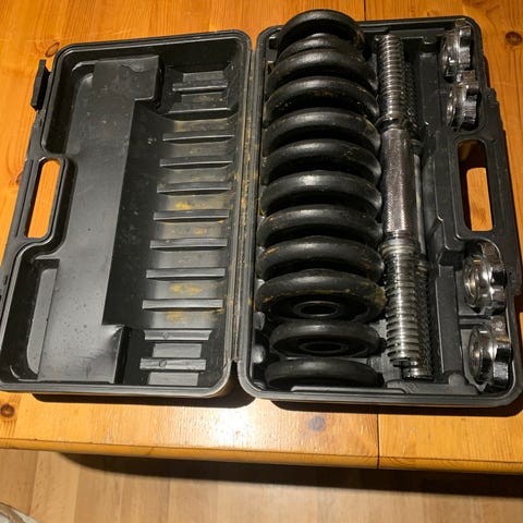 Settet inneholder vektskiver på \(1.25\) kg og \(2.25\) kg. Det følger med to vektstenger og gjengelåser for å feste vektskivene. Oppbevaringskofferten gjør det enkelt å organisere utstyret. Utstyret er egnet for hjemmetrening og styrkeøvelser
