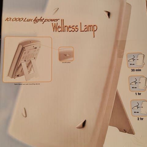 Melissa Wellness Lamp lysterapilampe i hvit utførelse. Lampen er beregnet for lysbehandling innendørs og har et frittstående design med støtteben på baksiden, slik at den kan plasseres på bord eller andre flater. Illustrasjoner på emballasjen viser anbefalt brukstid ved ulike avstander, for eksempel ca. 30 minutter ved 20 cm avstand. Egner seg til bruk i hjem eller på kontor der man ønsker jevn og kraftig belysning rettet mot ansiktet. Strømdrevet modell med frontpanel som gir et jevnt lysfelt.