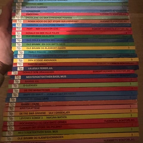Walt Disney Donald Duck’s Bokklubb bøker. Jeg har 37 bøker. Mange er vel godt brukt men en hver millennium har vel ett forhold til disse bøkene. Utrolig gøy å dra frem igjen med egne barn. Egner seg for høytlesning og egenlesing for barn.