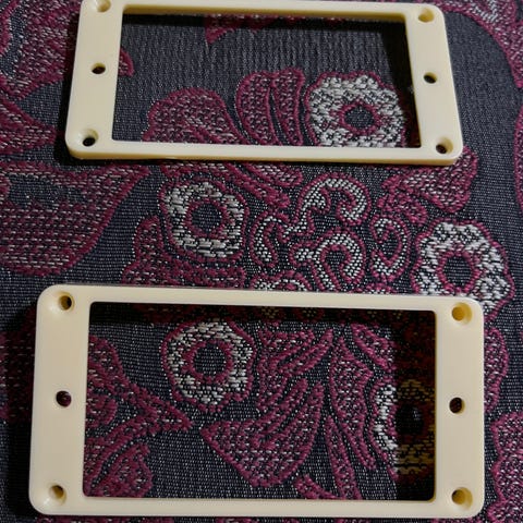 Pickup-rammer til gitar i svart plast. Settet består av to rektangulære rammer som brukes til montering og innfesting av pickups på elektrisk gitar. Rammene har forborede skruehull for enkel montering på gitarens kropp. Egnet som reservedeler eller ved utskifting av eksisterende pickup-rammer.