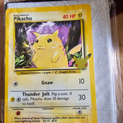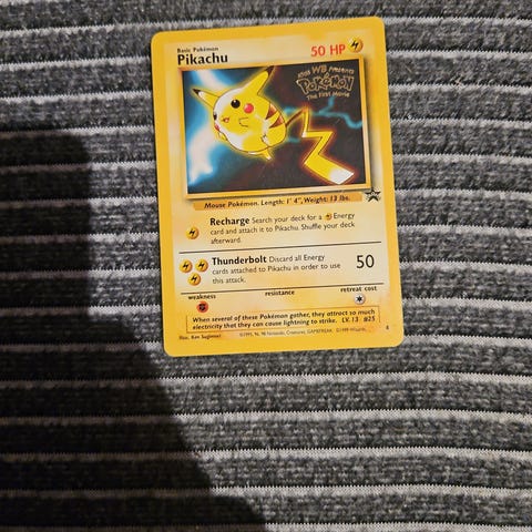 Pokémon Pikachu samlekort med 50 HP. Kortet viser Pikachu som Lightning-type med angrepene Recharge og Thunderbolt. Standard Pokémon-bakside med Pokéball-motiv. Egnet for samling eller bruk i Pokémon Trading Card Game.