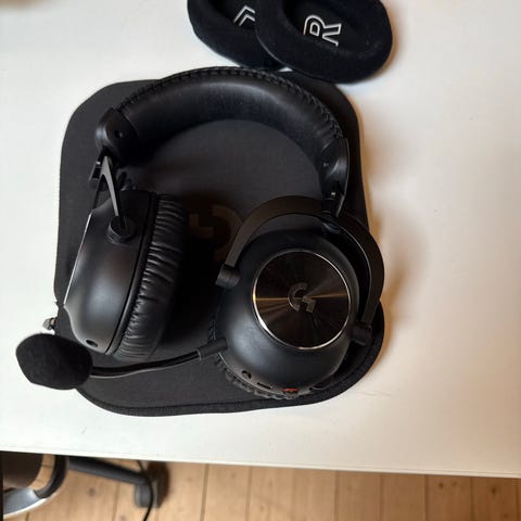 Logitech G Pro X gaming-headset i svart. Over-ear hodetelefoner med avtakbar mikrofon og polstret hodebøyle. Leveres med utskiftbare øreputer, bæreetui, kabler som vist på bildene. Egnet til bruk med PC og annen kompatibel spill- og medieutrustning som støtter tilkobling via medfølgende kabler og adaptere.
