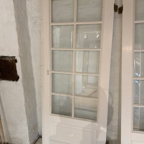 Doble innvendige dører med glassfelt og sprosser. Dørene har ovale felt med gult blyglass øverst og klart glass i resten av rutene. Leveres med karmrester, fjærhengsler i messingfarget utførelse og dørhåndtak. Egner seg som romdeler eller mellomdør innendørs der man ønsker lysgjennomgang og klassisk uttrykk. Mål og nøyaktig karmdybde bør kontrolleres mot eget døråpning før montering.