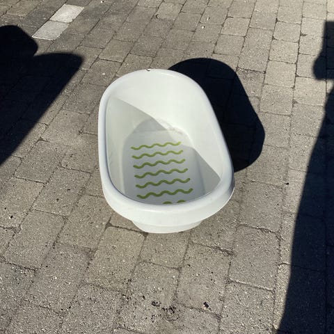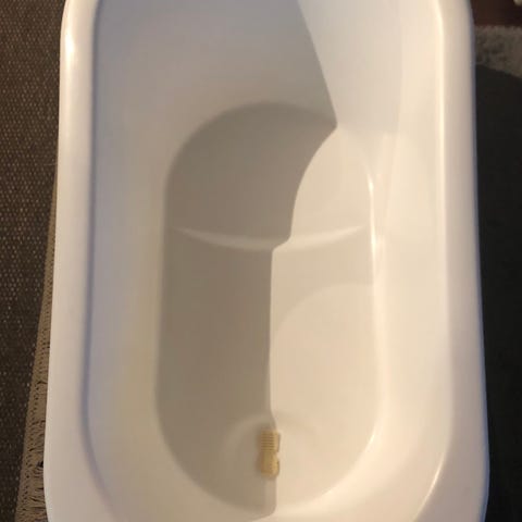 Badekar i hvit plast. Rektangulær form med avrundede hjørner og integrert bunnform. Egner seg til bading og vask, for eksempel til barn eller som ekstra balje i hjemmet. Innerlengde 70 cm.