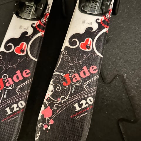 Salomon Shogun Jr 130 alpinski med Head bindinger. Lengde på skiene er 130 cm. Juniormodell med integrerte alpinstøvle-bindinger, egnet for barn/unge. Brede twintipski 85mm. Selges billig pga øverste plastlaget av topsheet har løsnet og må limes