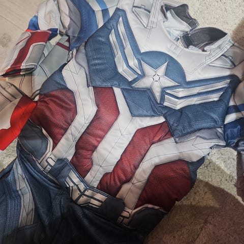 Captain America fra H&M kostyme i størrelse 110/116. Heldrakt til utkledning med flerfarget superheltmotiv.