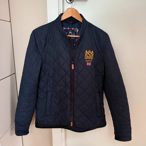 Selger en klassisk og stilig mørkeblå vattert jakke fra Morris Stockholm. Jakken har det kjente broderte emblemet på brystet og kordfløyel-detaljer i kragen. Fremstår som ny.