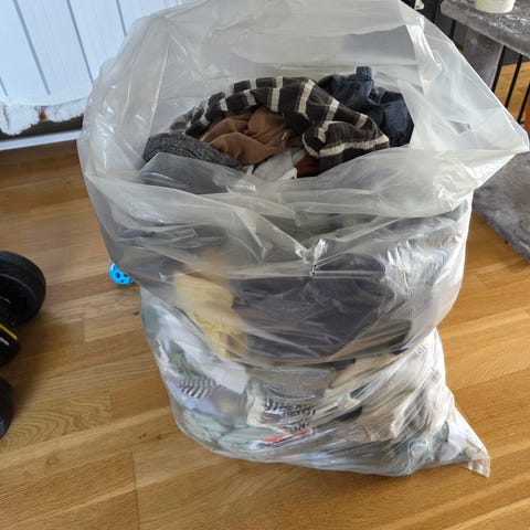 Stor skolesekk med masse fine klær, noe godt brukt, men meste lite og pent brukt. Størrelse 98/104