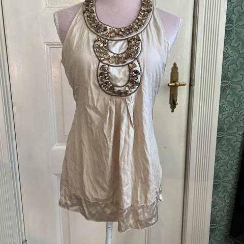 Hale Bob topp for dame i størrelse M. Toppen er i brun silke /offwhite med slangeskinnsmønster og har lange ermer. Utringningen er dekorert med perledetaljer i kontrastfarger. Materialet er lett og mykt, egnet til både hverdagsbruk og mer pyntede anledninger. Elsket - men for liten.