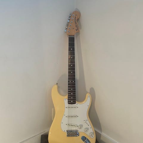 Fender Stratocaster limited edition. Meget fin og godt tatt vare på. Ikke vært "hit og dit," men bare vært brukt (lite) hjemme. Vet ikke alder, men ca. 15 år, tror jeg. Nye strenger, blank og fin. Veske, ledning og skuldersele følger med. Vet ikke noe mer, så ingen vits i stille spørsmål, for jeg kan ingenting om gitarer. Ikke så lett å sende, kan hentes på Notodden. Kan muligens levere sentralt på østlandet. Seriøse bud mottas gjerne. Kan evt. levere strekn. Notodden-Drammen- Drøbak-Askim mandag 23.feb.