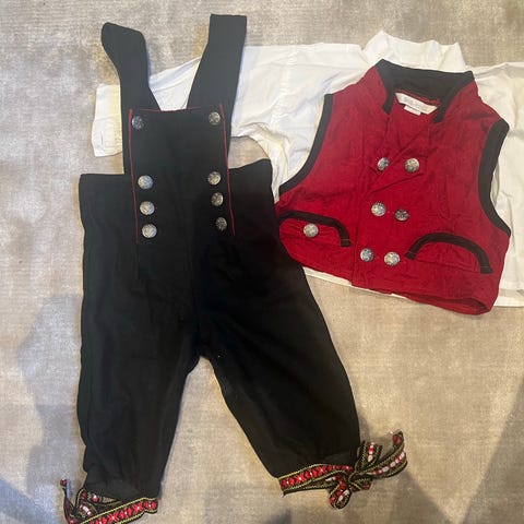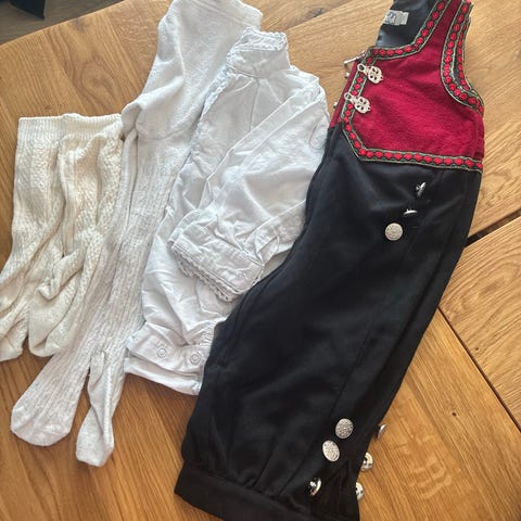 Skjortebody, festdrakt, strømpebukse og lue