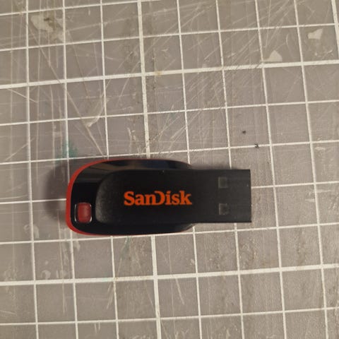 SanDisk iXpand Flash Drive Go USB-minne med kapasitet på 128 GB. Minnepinnen har USB 3.0 i den ene enden og Lightning-kontakt i den andre, og er laget for bruk med iPhone og iPad som har Lightning-port. Enheten kan brukes til lagring og overføring av bilder, video og andre filer mellom iOS-enheter og datamaskin. Huset er i metall med svart plastdeksel som kan roteres for å beskytte kontaktene under transport og oppbevaring. Knapt brukt, brukt i Tesla for lagring av dashcam og sentrymode opptak.