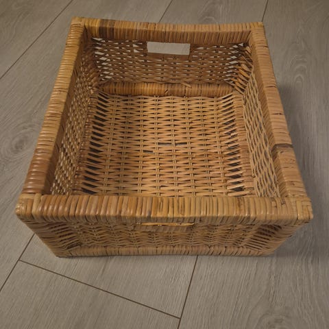 IKEA kurv i flettet rotting, str 68x34x34. Rektangulær kurv med åpne håndtak på kortsidene for enkel flytting.