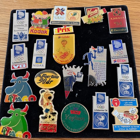 Samling emaljepins med ulike motiver og logoer. Pinsene er festet på ark i en perm, og motivene varierer fra nasjonale symboler til ulike merkevarer, figurer og illustrasjoner. Ulike former og farger er representert, hovedsakelig i metall med emaljefarge. Egner seg som samling for pinseentusiaster eller til dekor på klær, vesker eller lignende. Antall og enkeltmotiver kan telles eller spesifiseres nærmere ved behov. Selger 4 stk for 100kr.