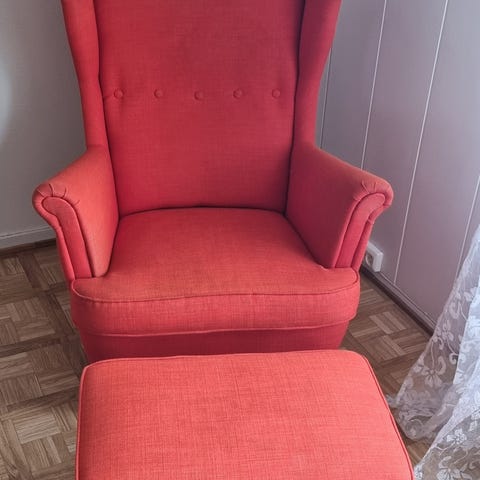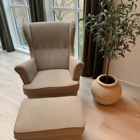 Stolen og puffen er lite brukt og har ingen skader. Fargen er en nydelig grå tone og stoffet har en lin finish.