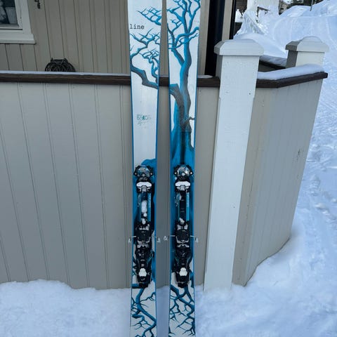 Litt brukt ski, men relativt ikke noen bruksmerker oppå skiene og på bindingene.