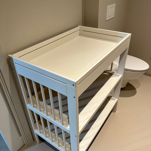 IKEA stellebord i hvit utførelse. Stellebordet har en opphøyd kant rundt stelleflaten og to åpne hyller under til oppbevaring av bleier, klær og annet utstyr. Plastbeholderne som vises på ett av bildene kan brukes til småting.