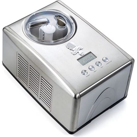 Vitamix ismaskin i hvit utførelse. Maskinen har integrert kjøleenhet og lokk med gjennomsiktig vindu som gjør det mulig å følge med på isproduksjonen. Egnet til tilberedning av iskrem, sorbet og andre frosne desserter i hjemmet. Enheten har ventilasjonsåpninger på siden og betjeningspanel på toppen for enkel bruk.