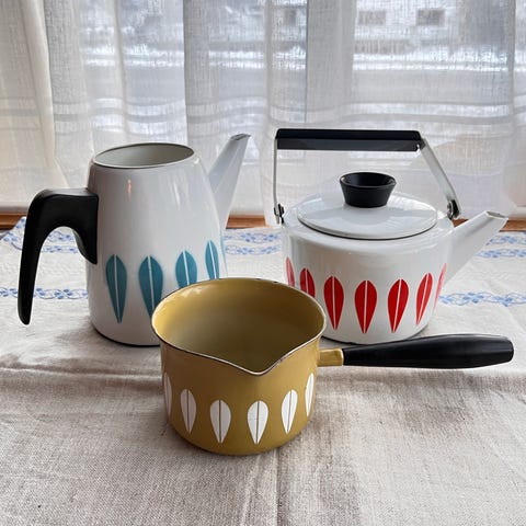 Selger også en annen kaffekjele og en sausekjele i lotus-mønster fra Cathrineholm
