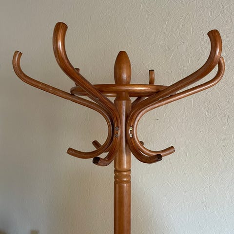 Designet av Nissen & Gehl for Aksel Kjersgaard. Produsert av Fritz Hansen trolig på 80-tallet. Stabil stumtjener i tre. Frittstående modell med rund fot. Øverst har den flere buede armer for oppheng av jakker og yttertøy, samt mindre knagger plassert både øverst og midt på stolpen for vesker, luer eller lignende. Utførelse i lyst treverk.