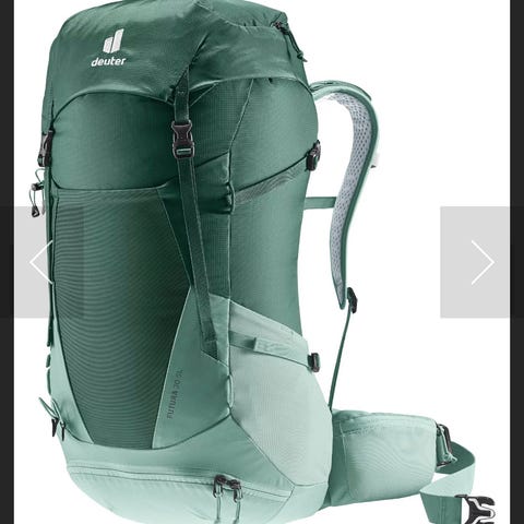 Deuter Futura ryggsekk i grønn farge med kontrastdetaljer. Sekken har polstret bæresystem med ventilert ryggpanel, justerbare skulderremmer og hoftebelte. Flere utvendige lommer, inkludert sidelommer for drikkeflaske og frontfeste som kan brukes til for eksempel hjelm eller ekstra utstyr. Topplokk med glidelåslomme og innvendig nød-instruksjon i lokket. Egnet som tur- og dagstursekk.