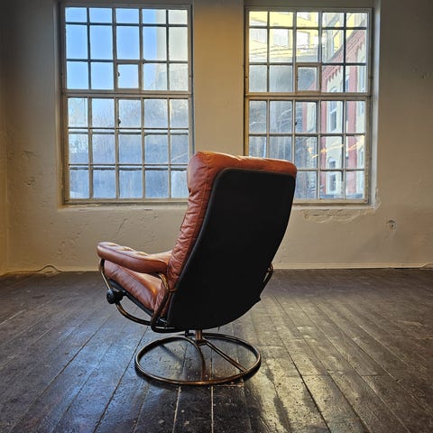selger her 2 stk av disse stresslessene med fotskamler. skinnet på den ene stolen har en flekk med slitasje i fargen på ene armlendet ( se bilde, dette kan kanskje farges inn igjen? ) ellers er stolene i god stand. disse må hentes
