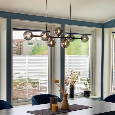 Vernon taklampe med 7 lys, kjøpt på lampehuset. Pærene kan følge med, men mulig noen trengs å byttes (usikker).