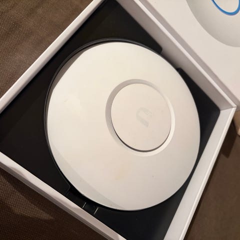 Kraftplug KP-01 nettverksenhet i hvit farge. Enheten har rund form og er beregnet for montering på vegg eller tak. På baksiden finnes tilkoblinger for strøm (12 V DC) og nettverk via Ethernet-port (RJ45). Enheten kan brukes som del av et nettverks- eller styringssystem der Kraftplug-komponenter inngår. Ytterligere funksjoner og bruksområder avhenger av tilhørende utstyr og oppsett.