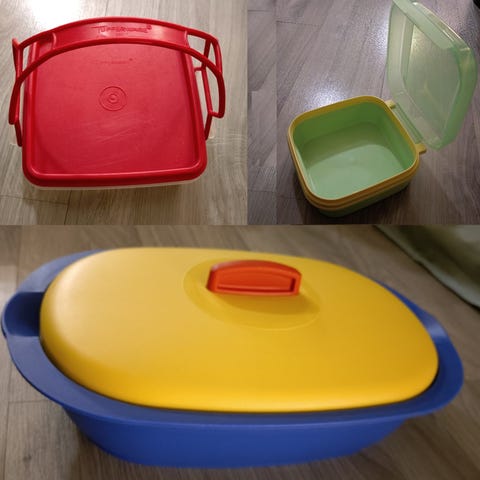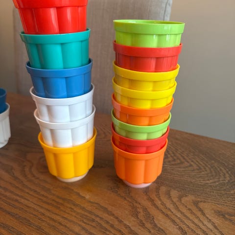 Tupperware former til dessert og gelé i plast, i flere farger. Settet består mindre former med riflet kant og løs bunn på de små.