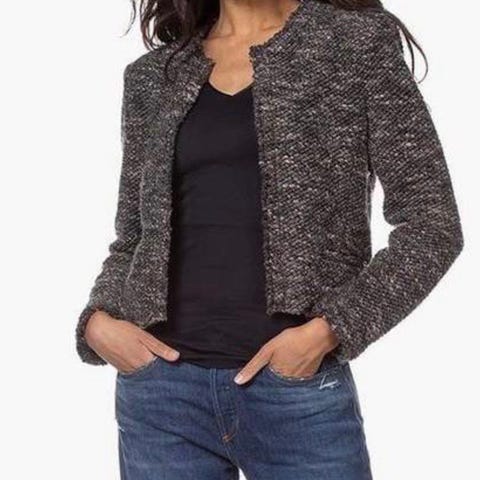 IRO kvalitets cardigan med ull for dame i størrelse 40. Cardiganen er i grå melert og er strikket. Modellen lukkes med trykknapper foran, som blir usynlige når dem er lukket. Garnet har en strukturert, boucle-lignende overflate som gir et melert uttrykk i ulike gråtoner.