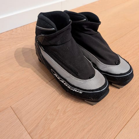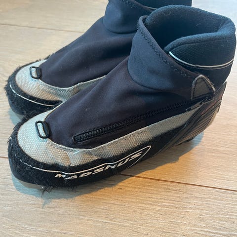 Skisko i str 32. Slitt materiale på tuppene- men ingen hull gjennom.