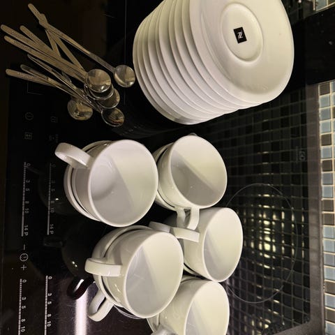 4 små og 4 store Nespresso-kopper og 7 asjetter. Pent brukt, men kan trenge en vask. Selges samlet. Espresso kaffe.
