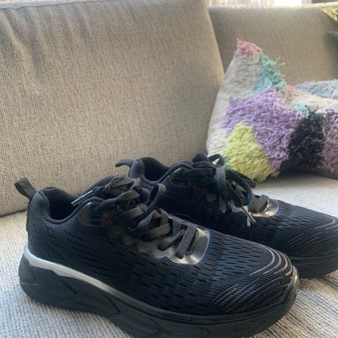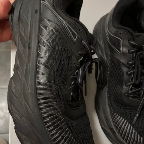 Hoka løpesko i størrelse 38. Modellen er helsvart med overdel i pustende meshmateriale og kraftig, dempet såle. Skoene er egnet til løping og annen trening på hardt underlag. Snøring for justerbar passform.