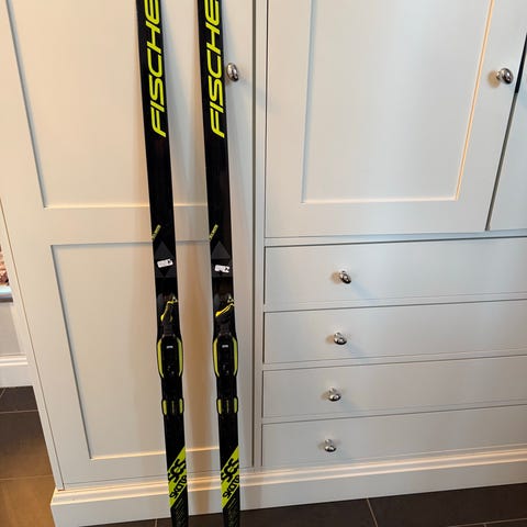 Fischer Sprint Crown langrennski på 150 cm. Klassiske smørefrie langrennski. Brukt 2 sesonger, men mye bruk igjen. Sort og gul design med Fischer-logo på oversiden.