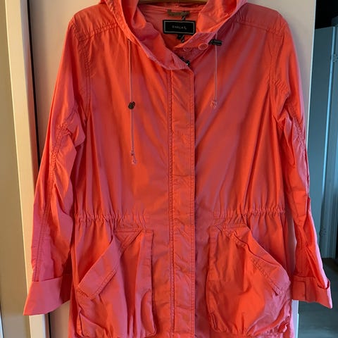 Vila jakke for dame i størrelse M. Jakken er rød og har hette med fuskepelskant. Den har glidelåslukking foran, justerbar snøring i midjen og lommer med glidelås. Materialet er syntetisk med fuskepelsdetalj på hetten. Passer som ytterjakke i overgangssesonger.
