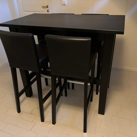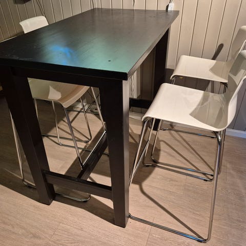 Selger et pent brukt kjøkkenbord med 3 tilhørende barstoler.