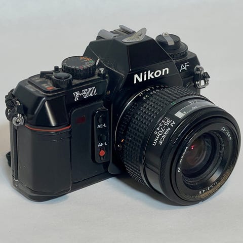 Nikon F90X med Nikkor 50mm f/1.4 objektiv og MD-26 databakstykke